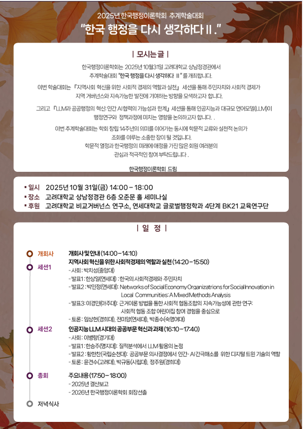2025년 한국행정이론학회 추계학술대회 공동세미나를 아래와 같이 안내해 드립니다. 한국 행정을 다시 생각하다Ⅱ * 일시 : 2025. 10. 31. (금) 14:00-18:00 * 장소 : 고려대학교 상남정경관 6층 오준문홀