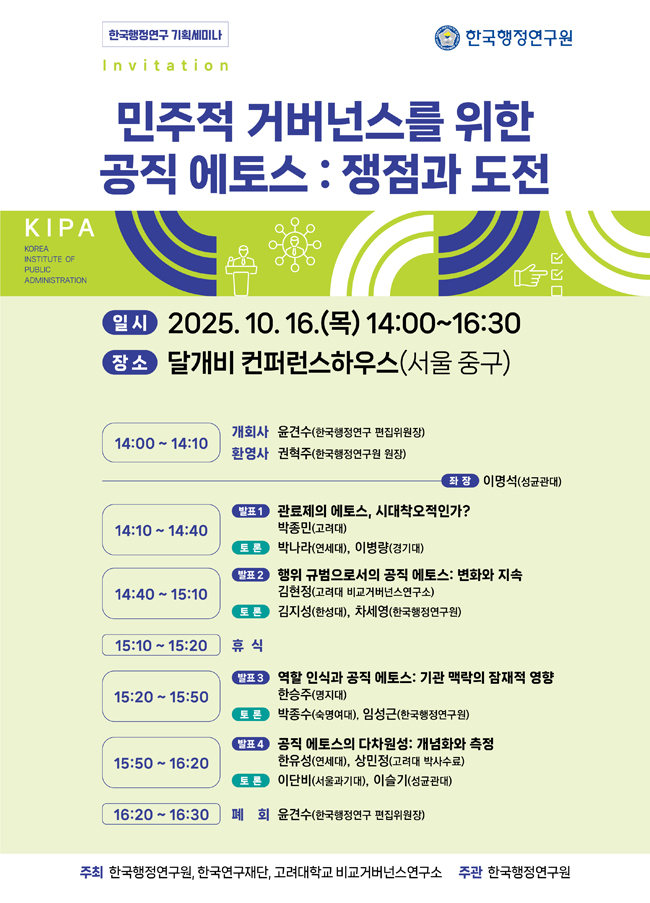 [한국행정연구 기획세미나] 민주적 거버넌스를 위한 공직 에토스: 쟁점과 도전을 아래와 같이 안내해 드립니다. 민주적 거버넌스를 위한 공직 에토스: 쟁점과 도전 * 일시 : 2025. 10. 16. (목) 14:00-16:30 * 장소 : 달개비 컨퍼런스하우스(서울 중구)